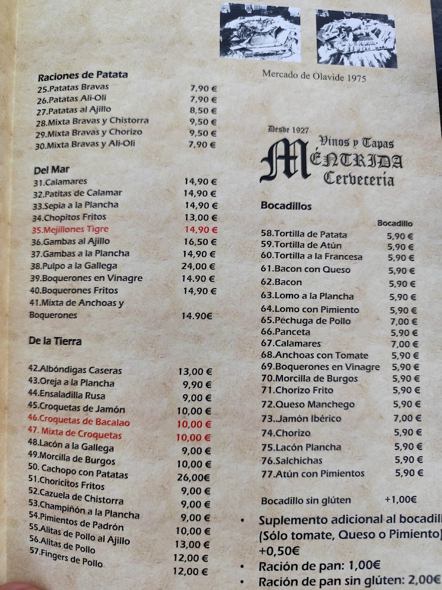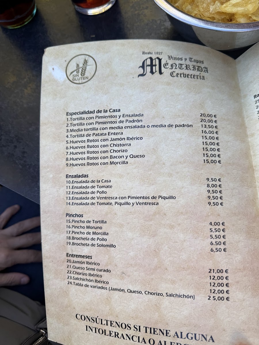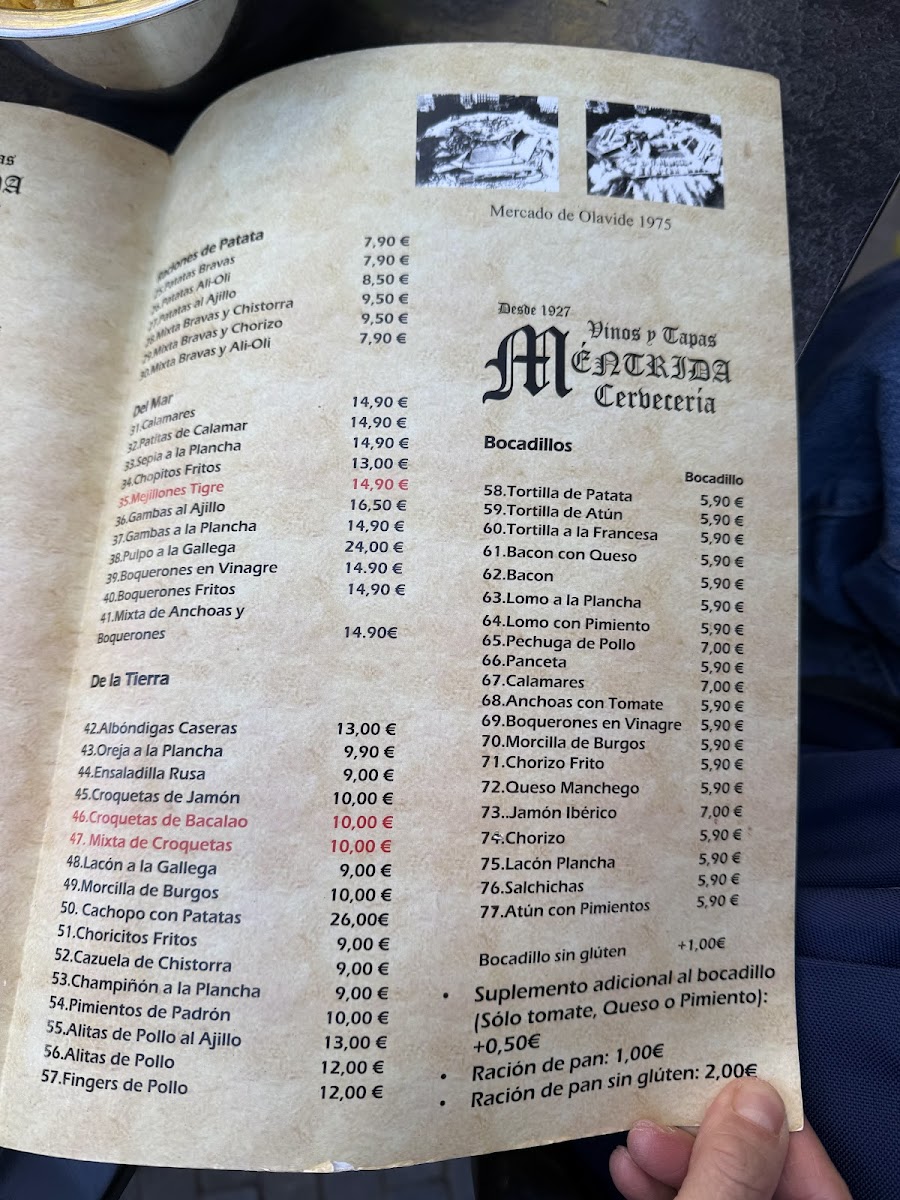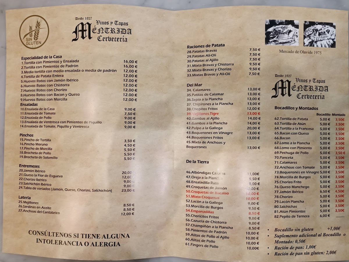 Bar Méntrida Cervecería offers a straightforward and welcoming tapas menu that fits perfectly with its lively, friendly atmosphere in the heart of Chamberí. The selection focuses on classic Spanish bites, from hearty patatas bravas to freshly fried boquerones and dishes designed with gluten-free options in mind.